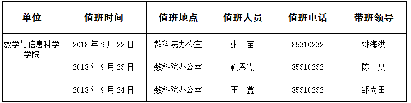 注意事项:1、按时上下班;2、保持办公场所干净整洁;3、注意安全和防火,每天定时巡查学院办公场所;4、做好假期信件的收发工作,每周一、周四取信件;5、每周一给花浇水一次;6、值班结束时须做好办公室钥匙的交接工作;7、遇紧急突发情况,及时向相关领导汇报。