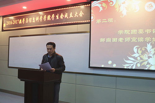 112下午16:30,我院于文津楼二层学术报告厅成功举办数学与信息科学学院20162017年度研究生暨本科生学生会成立大会我院党委书记田安政,团委书记邹尚田以及辅导员陈士宁莅临大会现场。此次大会由本科生张诗敏主持。大会在《中国共青团团歌》中拉开了帷幕。
